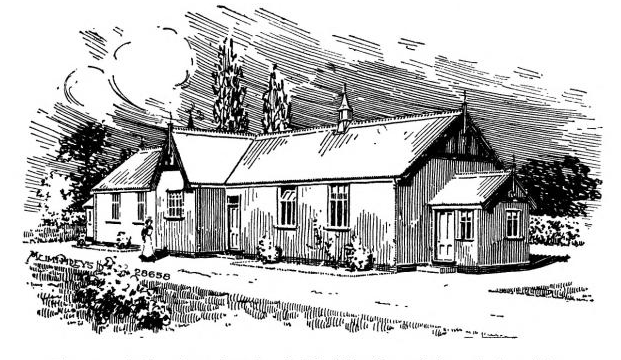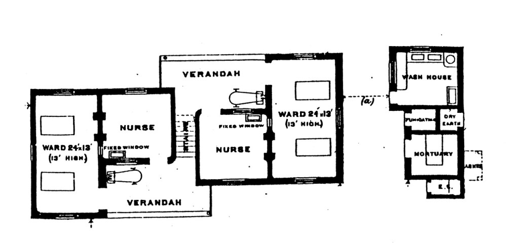Nationally, the Local Government Board was developing standard model plans for isolation hospitals in different types of town. We know from these that rural isolation hospitals were typically small, and attractively laid out like detached villas. This was in contrast to those in larger conurbations which tended to have parallel rows of detached wards, described as “pavilions” and designed to allow free movement of air. The example plan, below, shows one of the options suggested by the Local Government Board in 1888: a small building for four patients, with central accommodation for nurses over two floors, and two single-storey wards, each with a large verandah. There is a detached laundry and mortuary.