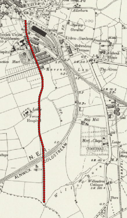In the 1860’s none of the houses around Duke Street, or Bridge Street had been built. Beyond the workhouse there were only fields. However, Ordnance Survey maps from the time show a road here, which continued – almost directly southwards – beyond the later line of the Cornhill Railway, to the Willow Burn, where it turned south-eastwards to join the Great North Road. This followed the route of the old wagonway, which had been built in 1809 to bring coal into Alnwick, then closed around 1850. The wagonway would later give its name to the road, but it is not given a name on the early Ordnance Survey Maps.