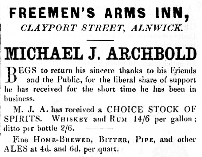The number of pubs in Alnwick peaked in the decades that followed the Beer Act. Here in Clayport the William IV was just above the Blue Bell, and below the Pack Horse. On the other side of Clayport the Anchor stood where buses leave today’s Bus Station. Another pub opened next door to the Anchor, and the Grey’s Inn stood at about the middle of today’s Bus Station. There was a Beer House at the other corner. The Clayport Tower was a little further up Clayport, and the Bird and Bush around the corner in Dispensary Street.