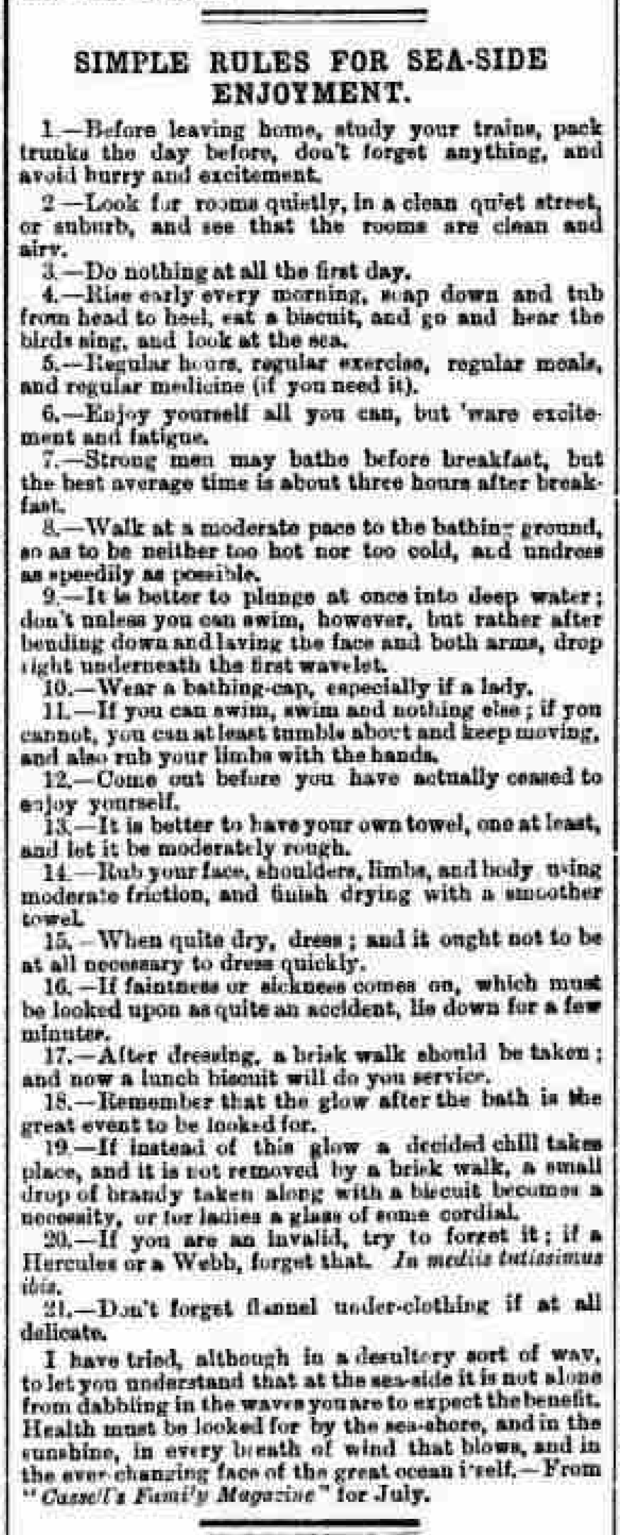 I have tried, although a desultory sort of way, to let you understand that at the sea-side it not alone from dabbling the waves you are to expect the benefit. Health must be looked for by the sea-shore, and in the sunshine, every breath of wind that blows, and in the ever-changing face of the great ocean itself.