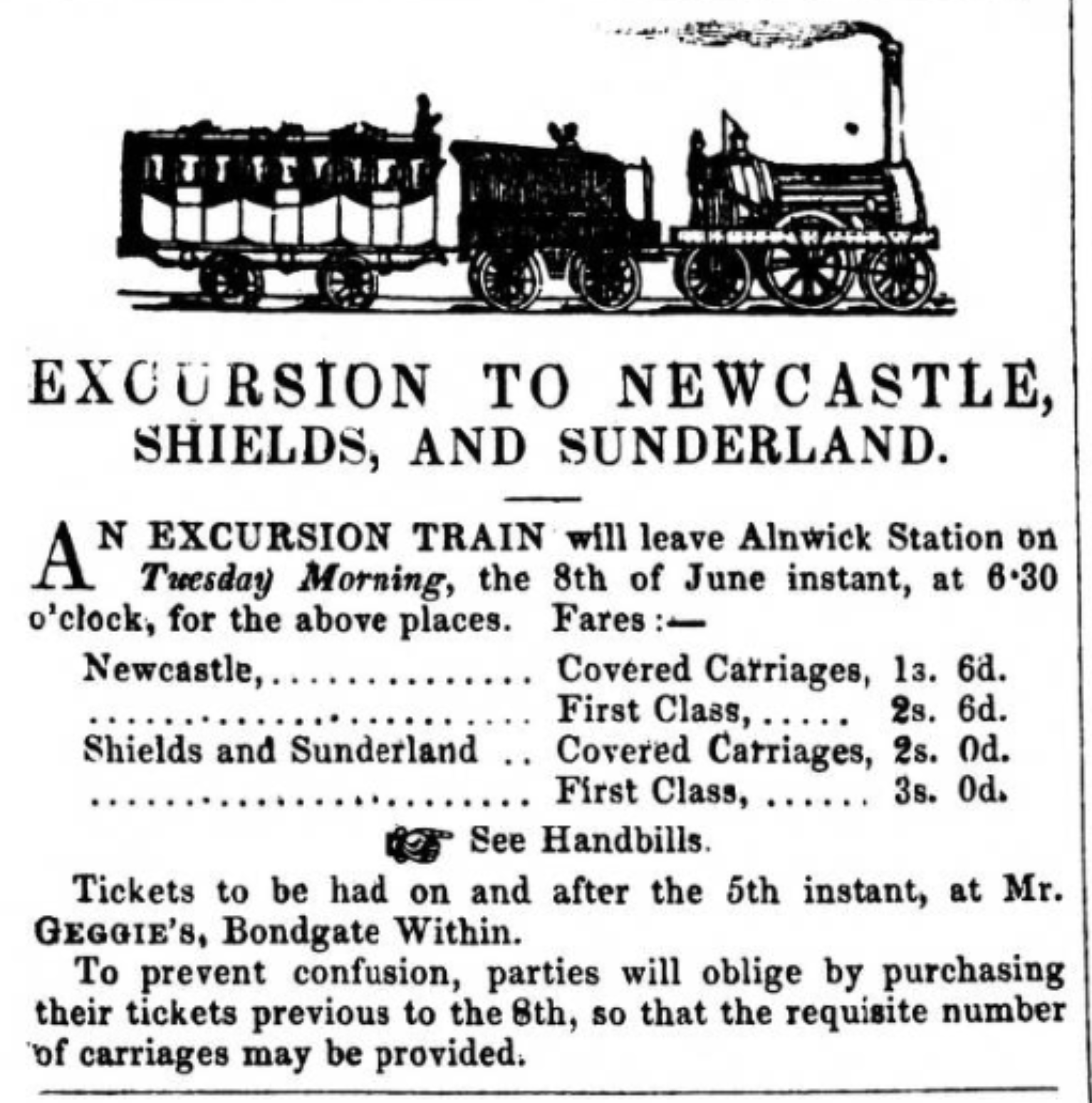 We haven’t managed to find what the return fare from Alnwick to Newcastle would be in 1854, but in 1858 Mr Geggie would sell you a ticket for an excursion to Newcastle for 2s 6d first class, or 1s 6d in a covered carriage. Based on the Bank of England Inflation Calculator that would make the 1858 costs of an excursion to Newcastle from Alnwick equivalent in today’s money to around £30 first class, or £20 in a covered carriage.