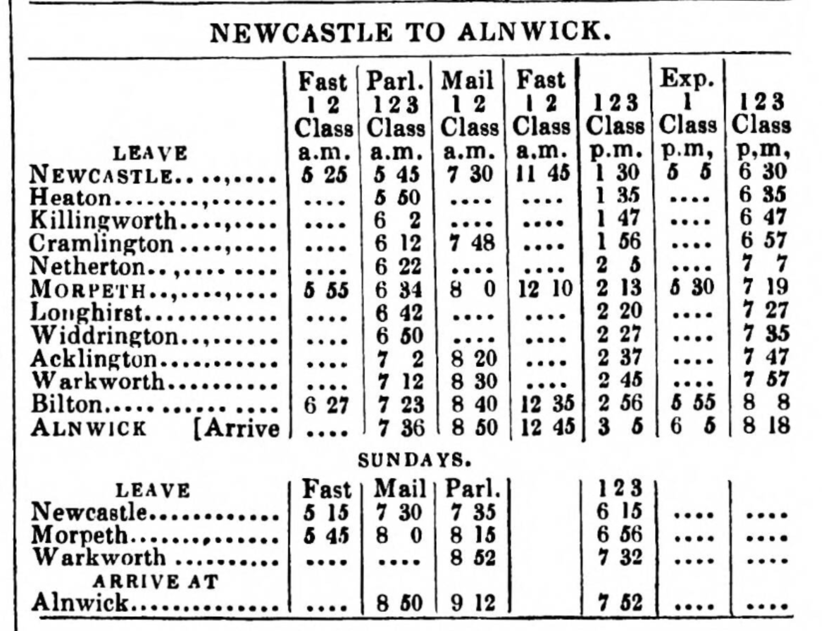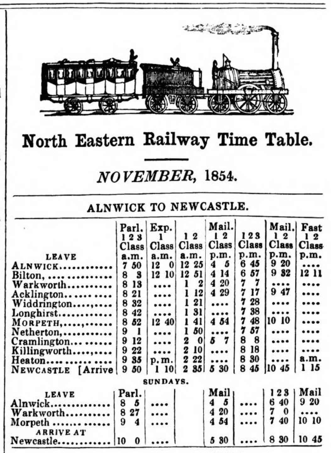The first Alnwick Station opened in 1850. This was the timetable in 1854. Today’s equivalent would be an X20 bus at 8.38 from the Infirmary, changing to LNER at 9:01 at Alnmouth. That should arrive in Newcastle at 9:27