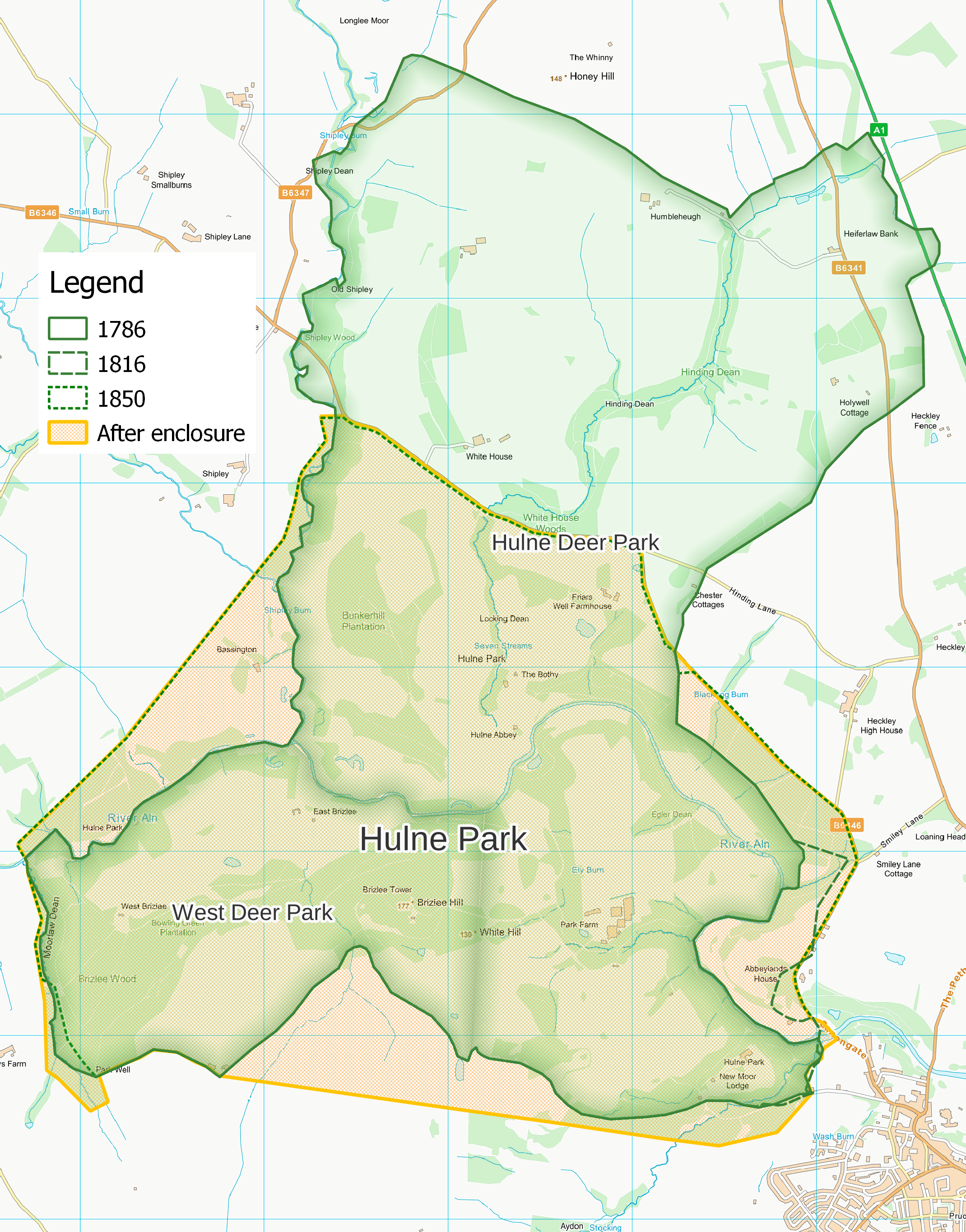 There have been no subsequent changes to the perimeter of Hulne Park. Any further work on the wall has been for maintenance or repair. For example, on 3 November 1900, about forty yards of the wall were washed down by water rushing into Shipley Burn.