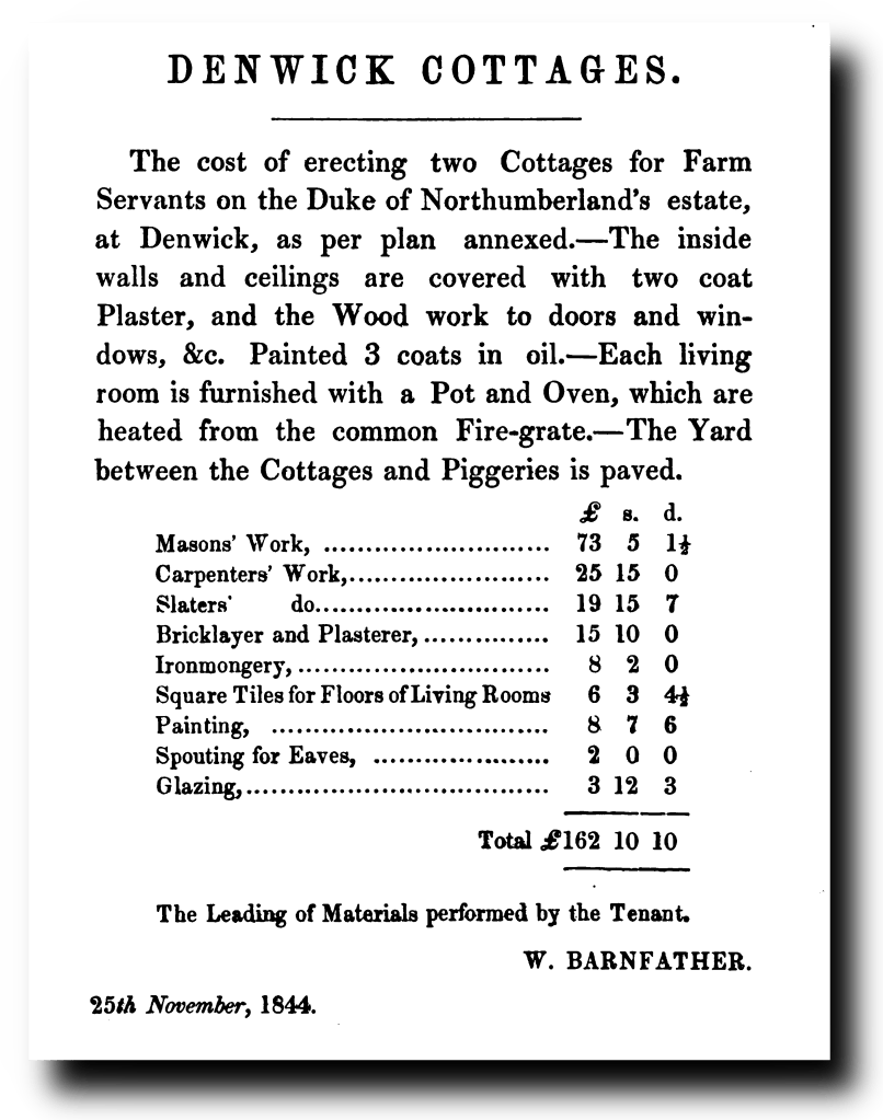 He estimated the cost of these two cottages in Denwick at £162 10s 10d.